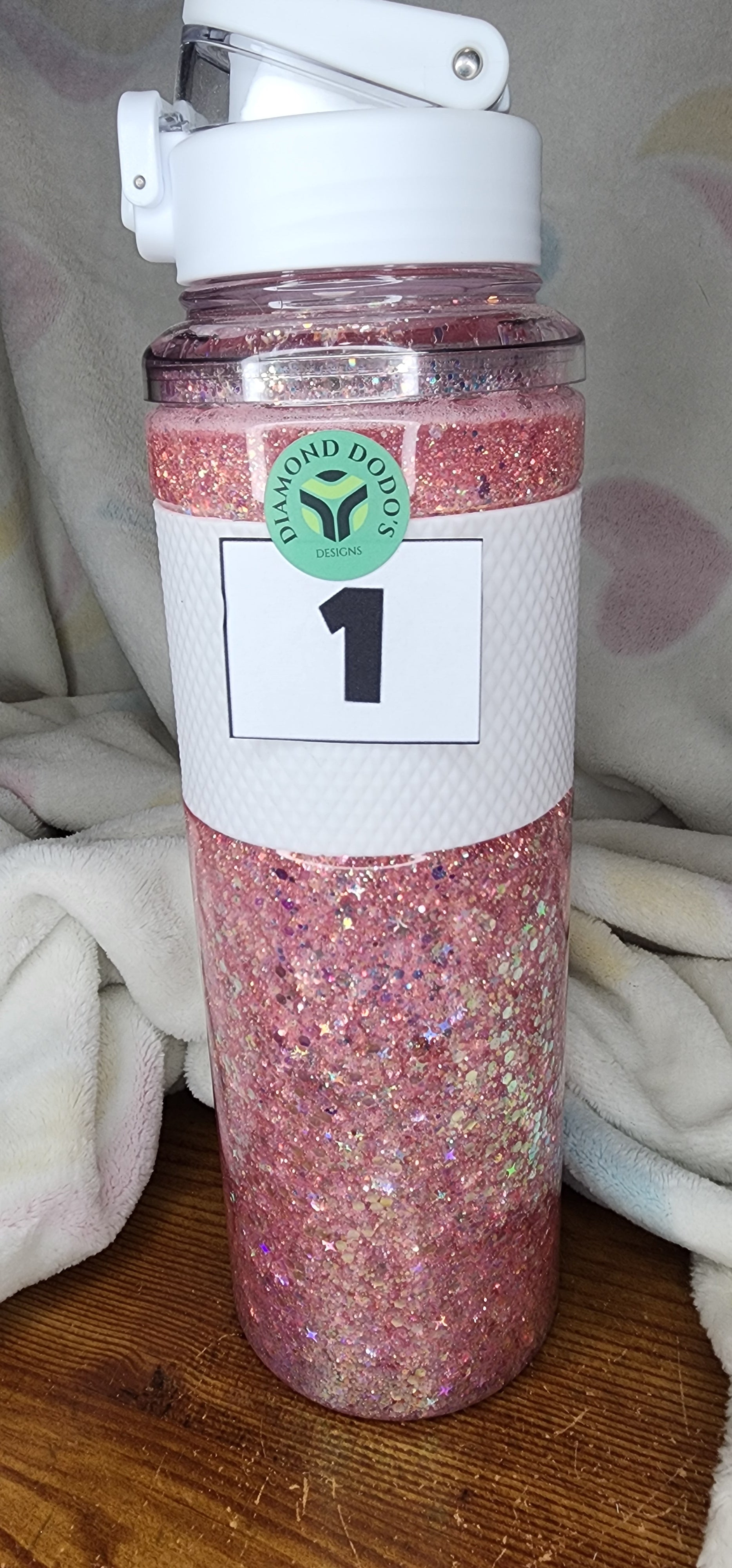 32oz white water bottle with light pink AB glitter #1 *THIS IS AN OLDER ITEM AND THE LIQUID HAS EVAPORATED SOME OUT OF THE SNOWGLOBE AND THE UV RESIN USED TO SEAL BOTTOM HAS TURNED YELLOW *